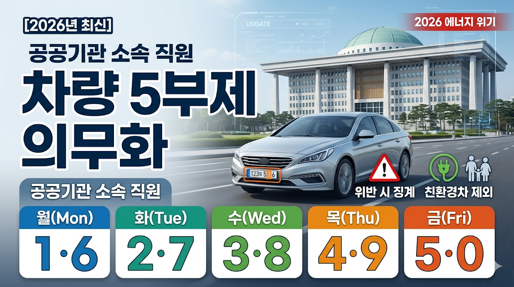 2026년 3월 25일부터 중동발 에너지 위기로 공공기관 차량 5부제가 전면 의무화되었습니다. 민간 확대 가능성, 전기차 예외 조건, 징계 수위 등 실시간 정부 정책을 완벽하게 분석해 드립니다. 과태료와 불이익을 피하는 꿀팁을 확인하세요.목차2026 에너지 위기: 차량 5부제 전격 시행 배경차량 5부제 적용 대상 및 상세 운영 규정자주 묻는 질문(FAQ) 및 실전 대비 팁0. 빠른 요약 (Key Takeaway)Trend: 2026년 3월 25일 0시부로 전국 공공기관 대상 차량 5부제가 의무화되었으며, 상습 위반 시 징계 조치가 내려집니다. 민간 부문은 현재 자율 참여이나, 경보 단계 격상 시 의무화가 검토되고 있습니다.Value: 본인 차량의 운행 제한 요일과 예외 조건(전기차, 유아 동승 등)을 명..
